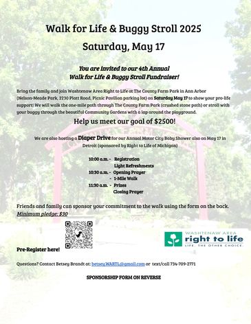 We invite you to join us at our annual Walk for Life in Ann Arbor! Register and fill up a sponsorship form for our 1-mile walk at County Fa...